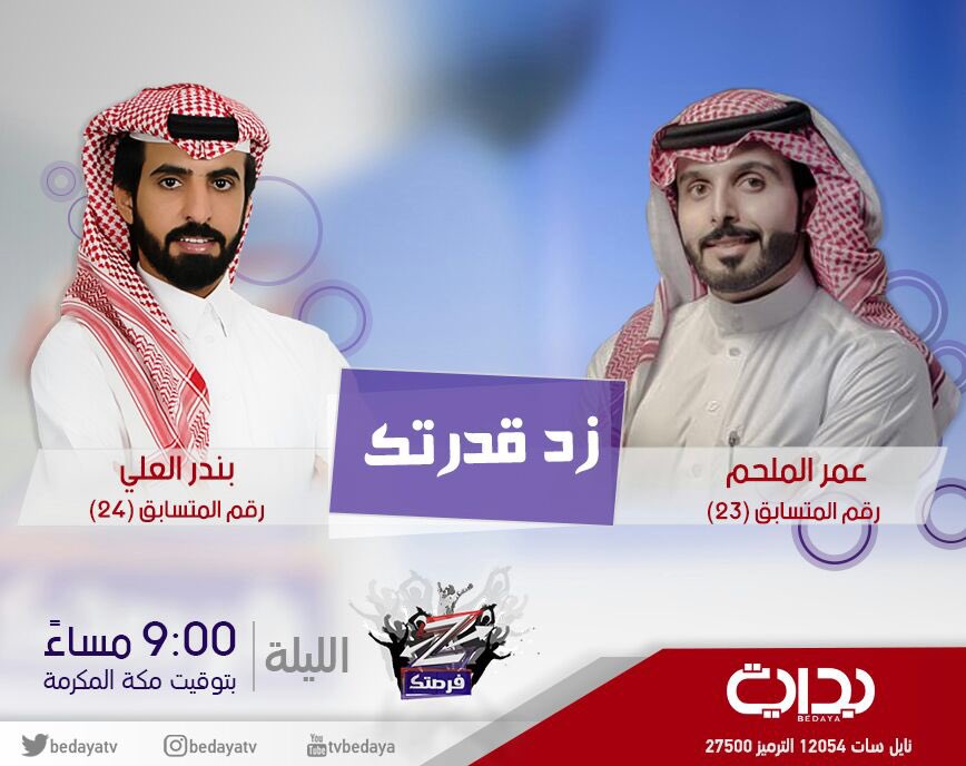 بداية A Twitter زد قدرتكـ المتسابق عمر الملحم والمتسابق بندر العلي الساعة ٩م زد فرصتك5